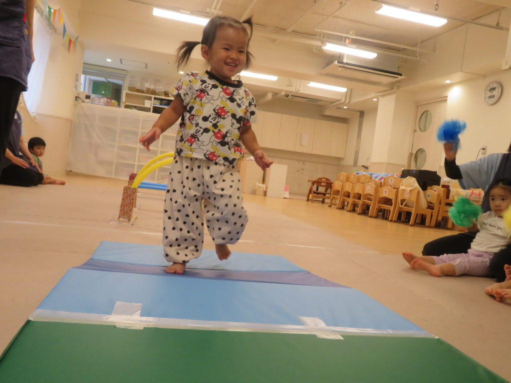 1種目めはみんなが大好きな体操から♪ 曲に合わせて体を動かしたり、保育者やお友だちの動きを真似して体を動かしていましたよ。