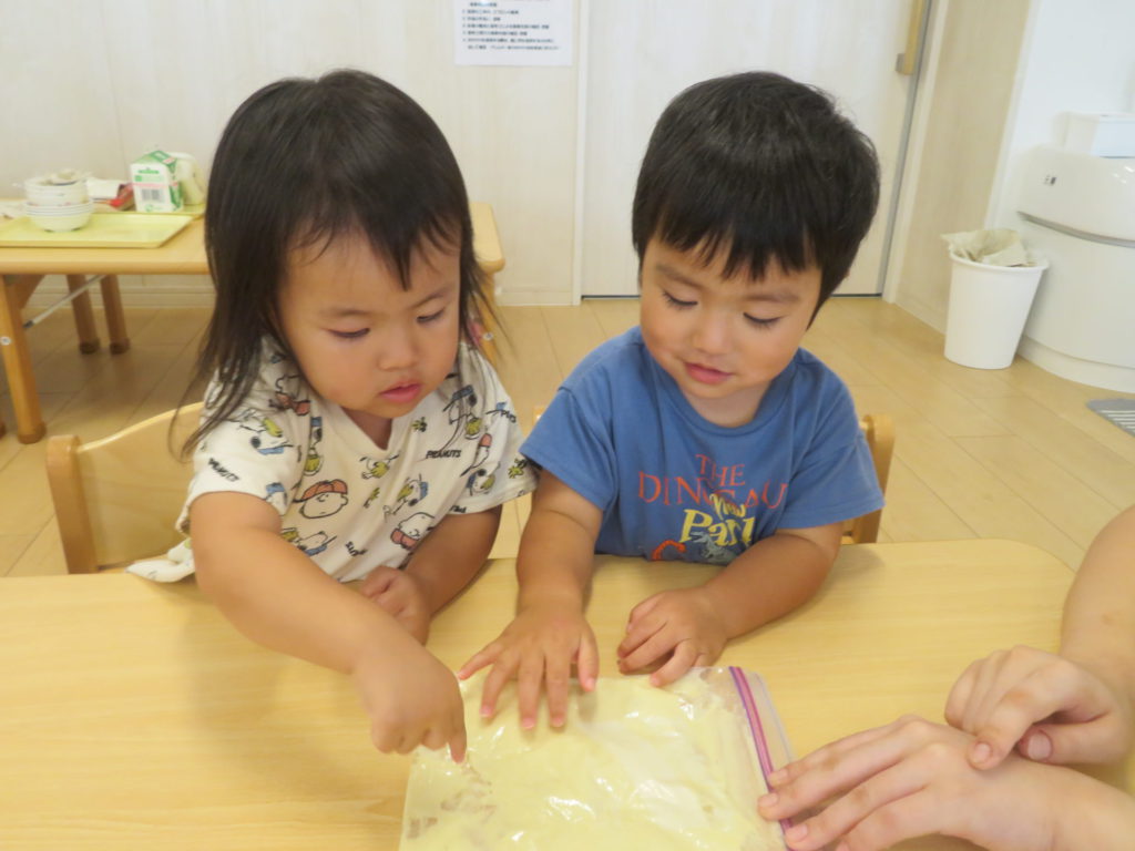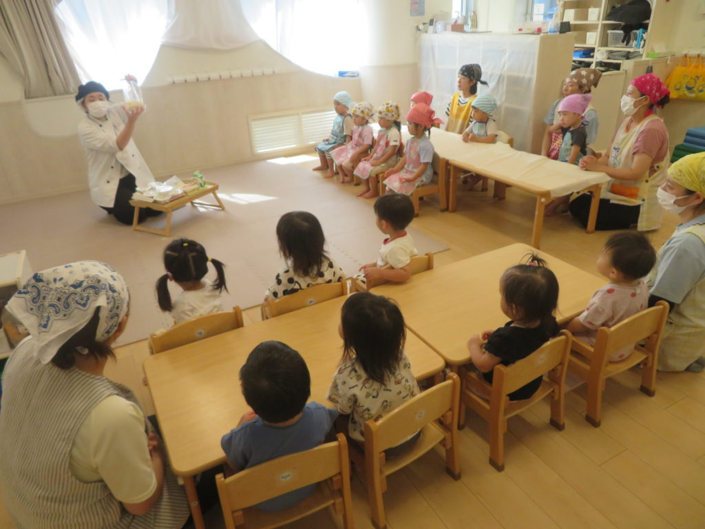 2歳児くま組さんは、ホットケーキミックス、牛乳、砂糖、マーガリンとそれぞれ担当の食材を決めて、
