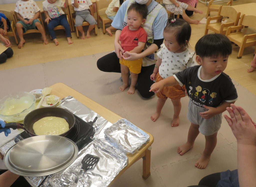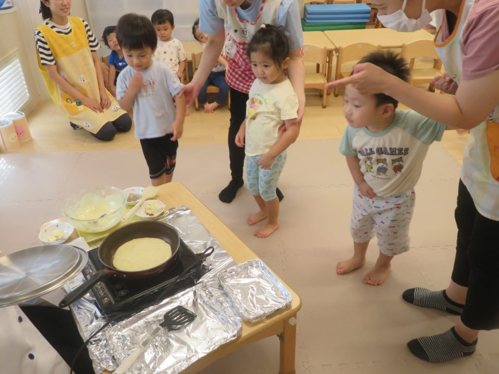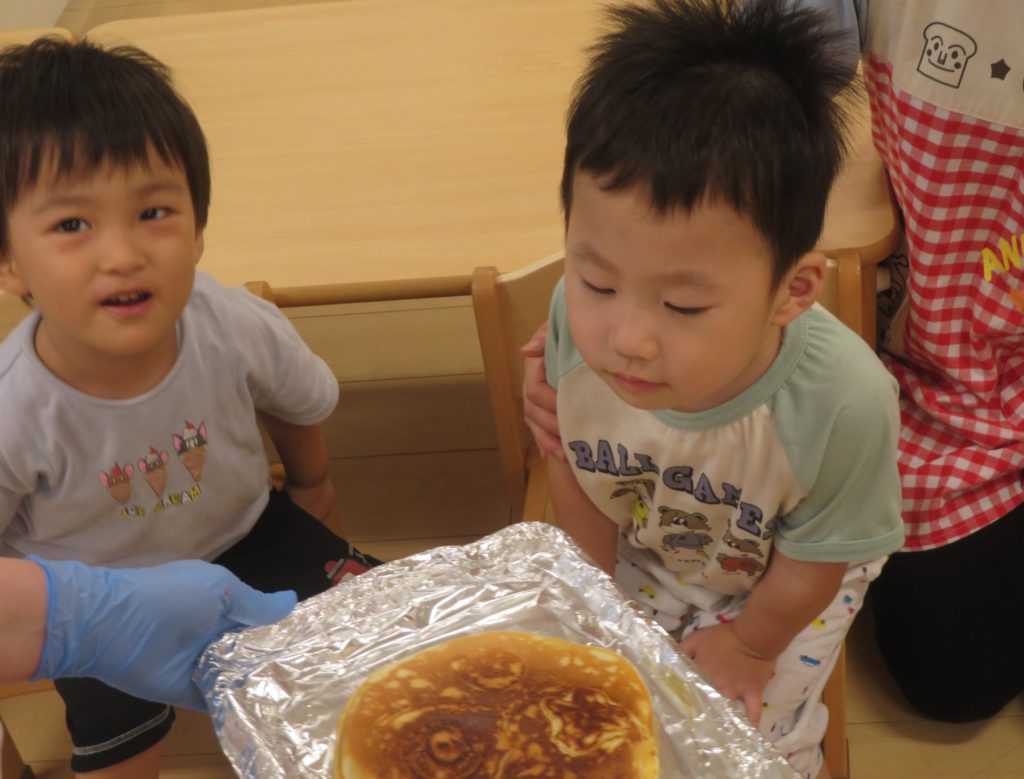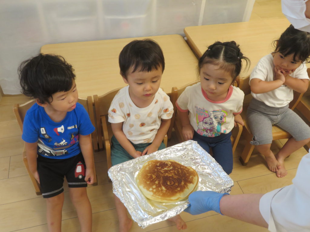 出来上がった生地は、3時のおやつの時間に子どもたちの目の前で焼きました!