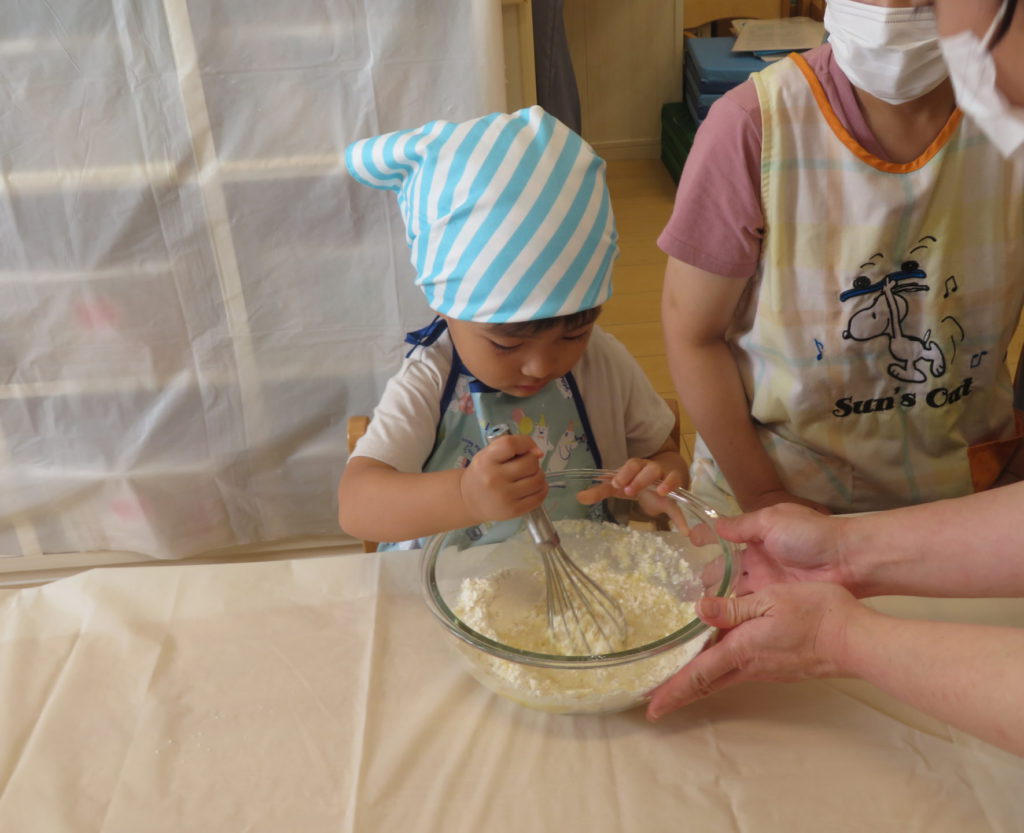 始めは、材料がこぼれないようにゆっくりと混ぜていき、くま組さん全員で交代で生地を混ぜていきました。