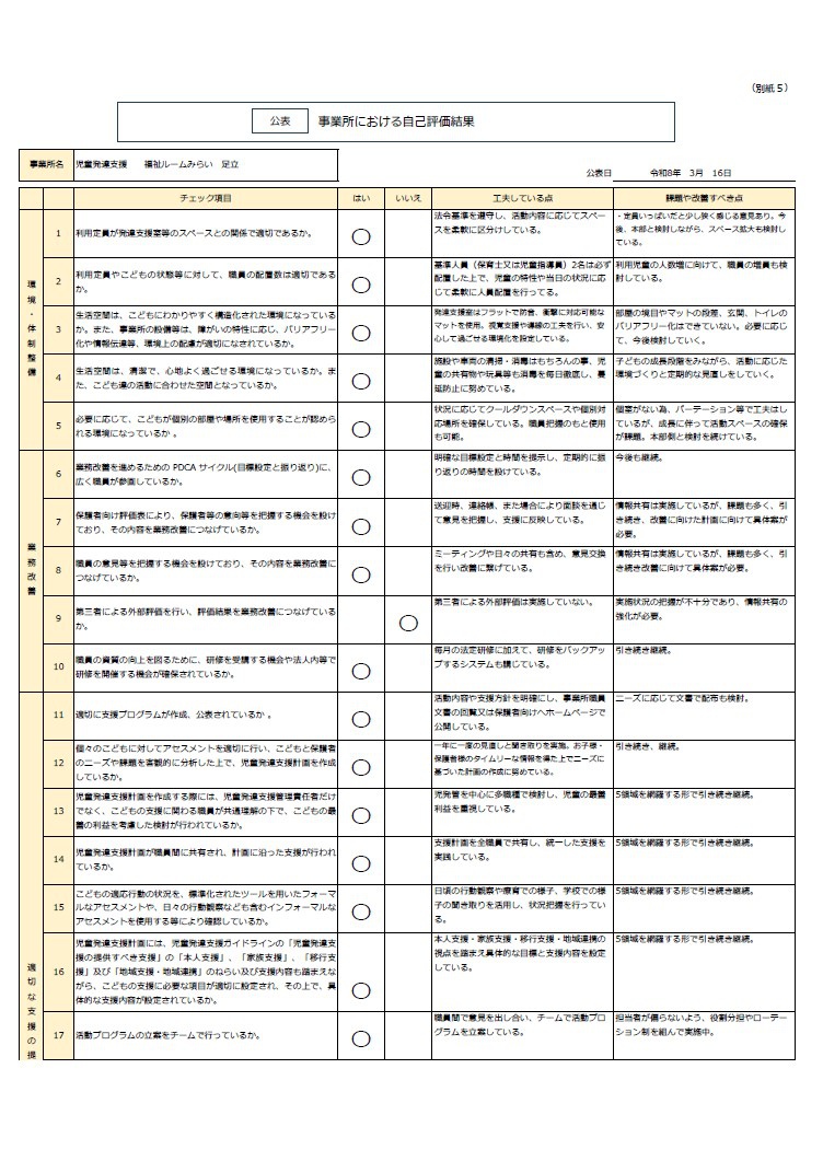 2026.03.16 令和7年度放課後等デイサービス自己評価表を公表します