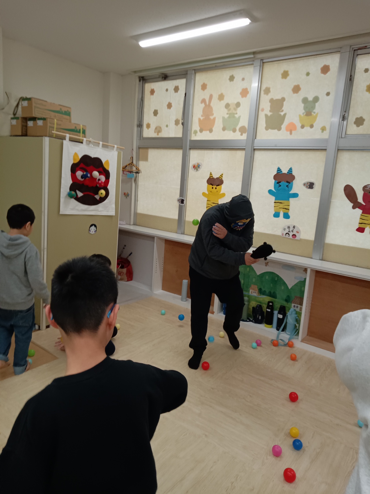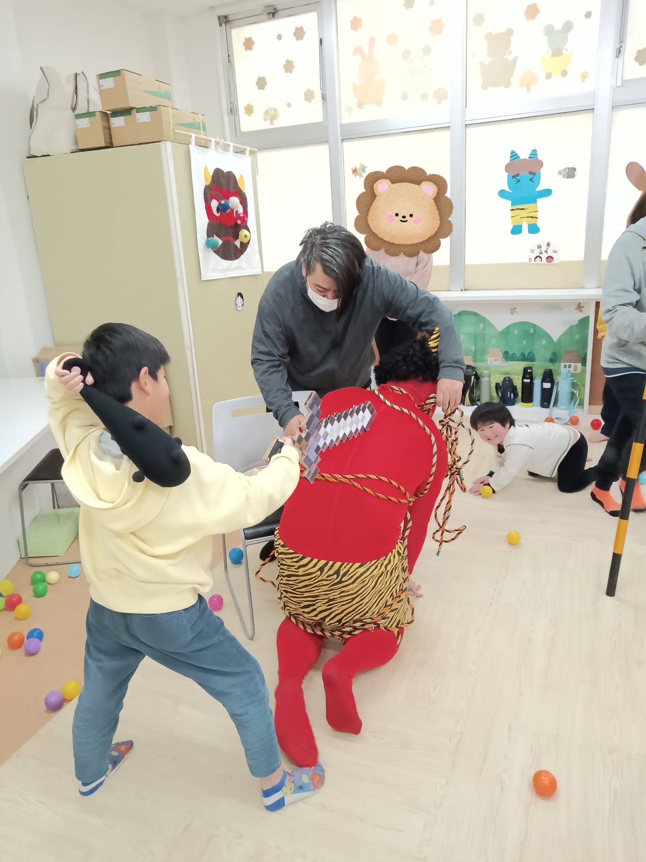 節分についてのお話を聞いていると扉の方から鬼が登場、、、かと思ったら青おにのお面をかぶった職員でした(笑)