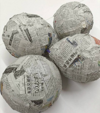 先月からお友だちと、風船に新聞紙をやぶって、でんぶんで作った糊で