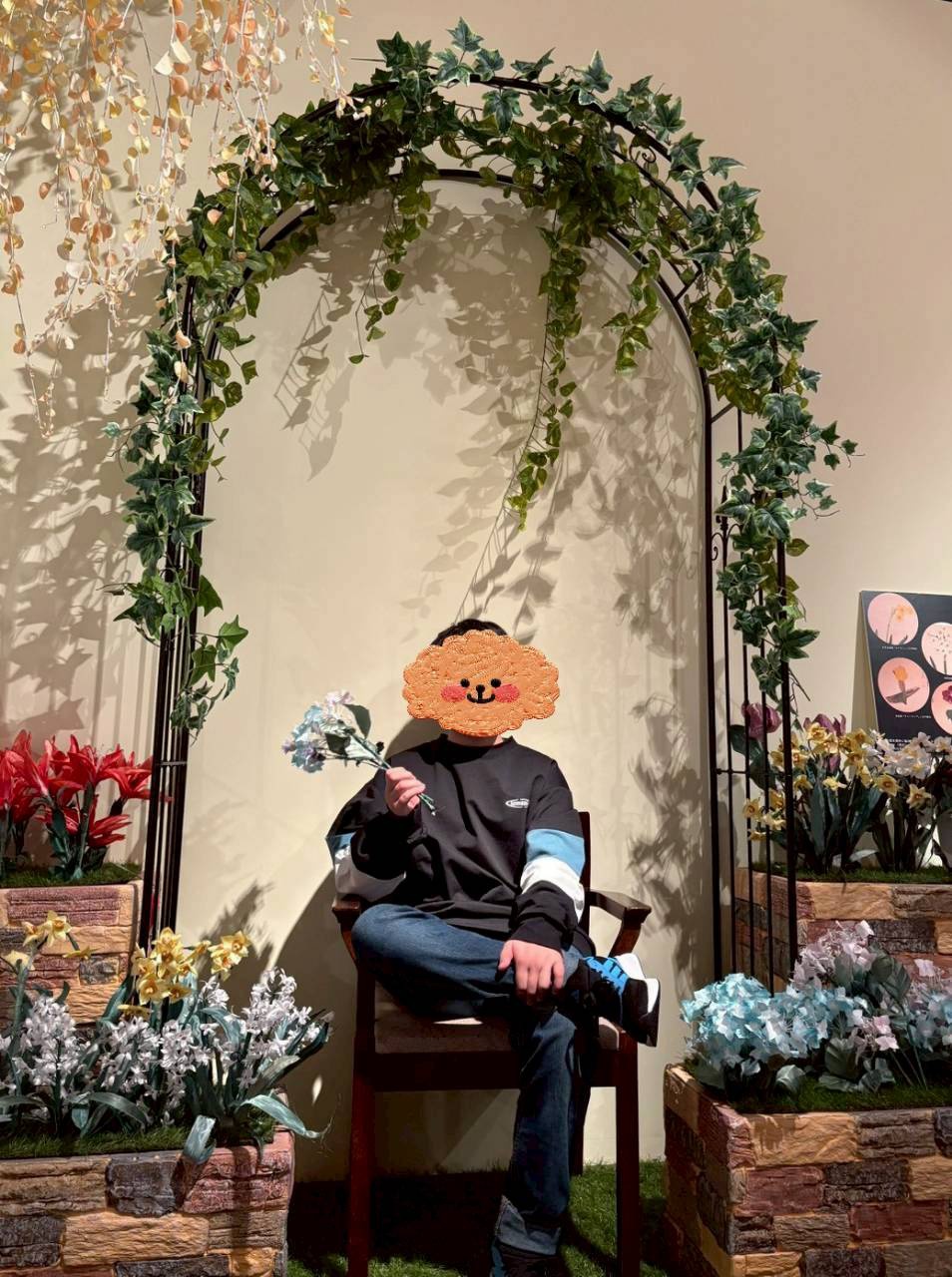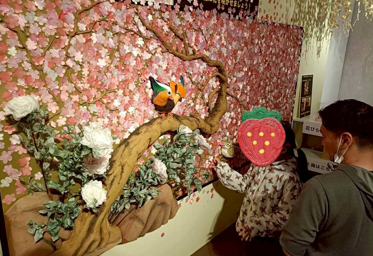 花に囲まれた椅子や、江戸時代の日本画に描かれた桜と鳥に実際に花びらを貼り付ける展示は
