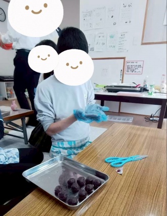餅の中に入れるあんこやチョコを子ども達が二手に分かれて、みんなで協力しながら作業に取り組んでいました。
