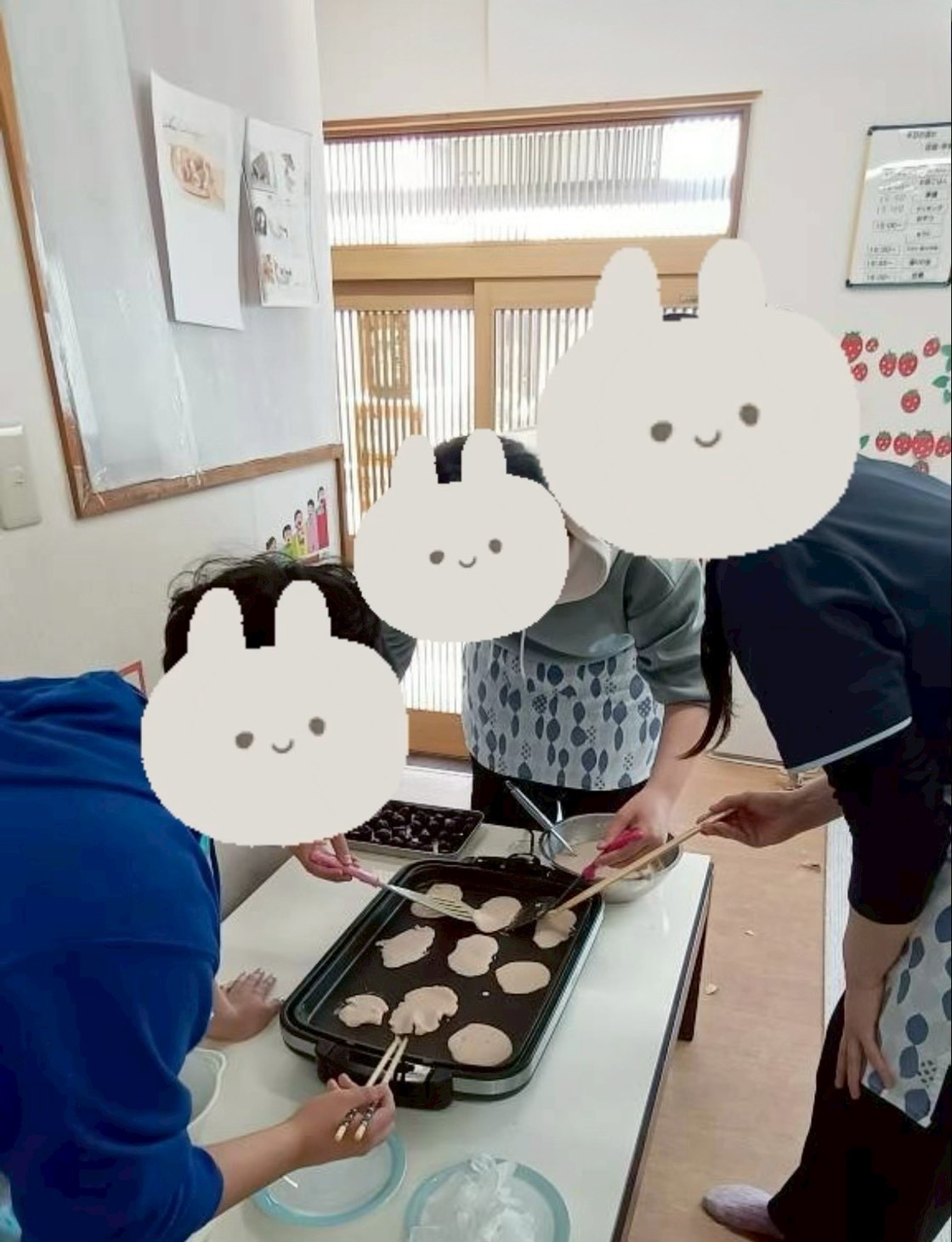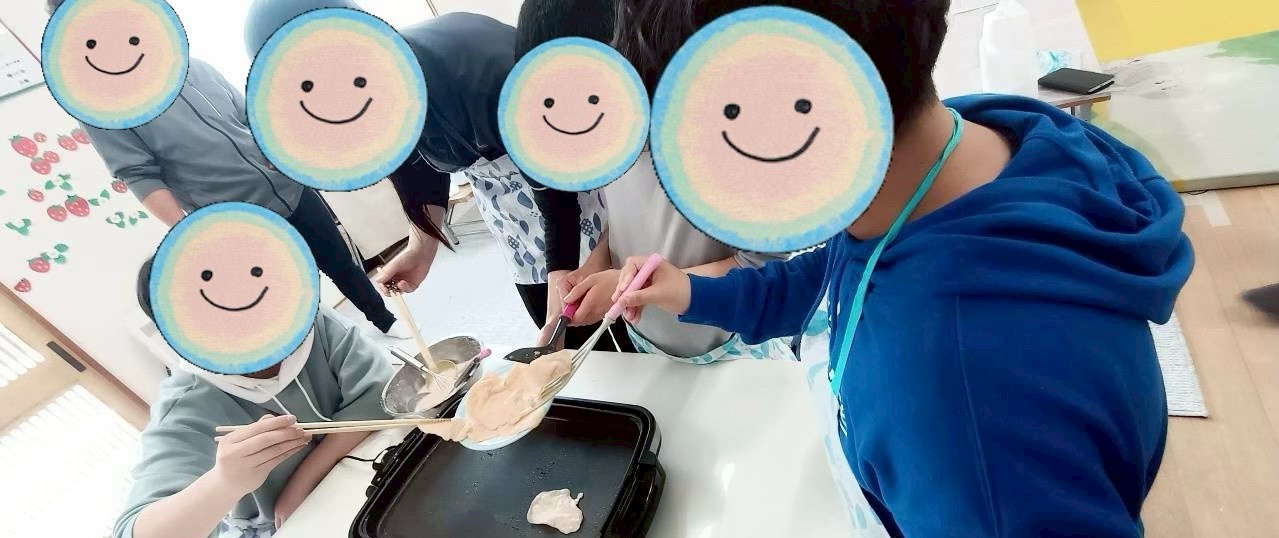 餅の方は、ホットプレートに生地を広げて焼きました。男の子たちがアツアツのホットプレートで沢山焼いてくれたよ!