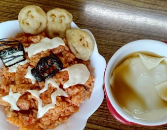 チキンライスにハロウィン海苔をトッピングして、星形チーズも乗っけてできあがり♡