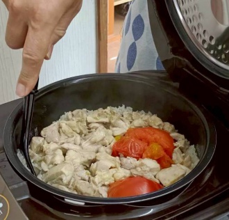 まずは炊飯器にお米と鶏肉と丸ごとトマトをドーン☆