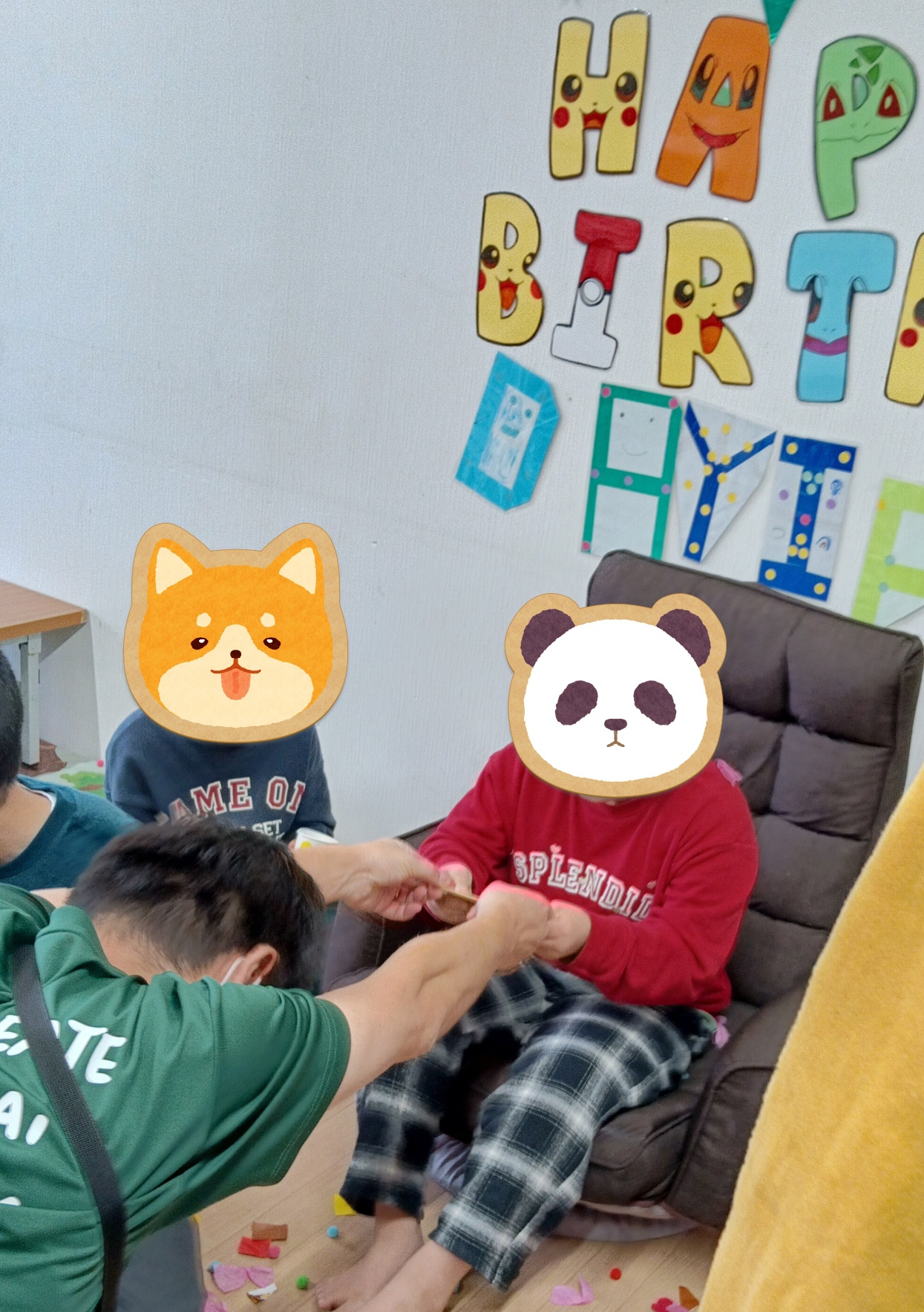 自分でお気に入りの椅子を持ってきて、デコられた壁の前でハッピーバースデーを歌ってもらいます。