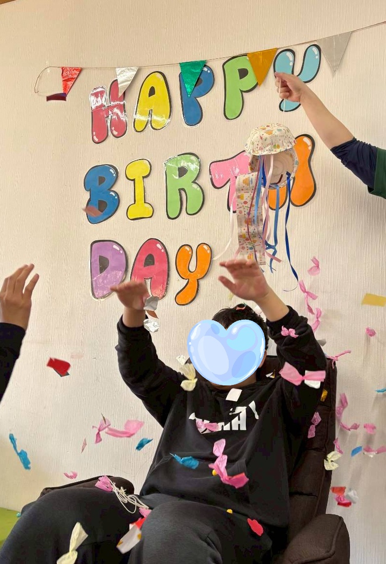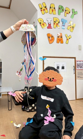 お友だちにもくす玉や、クラッカー、ビックリ箱でお祝いして、