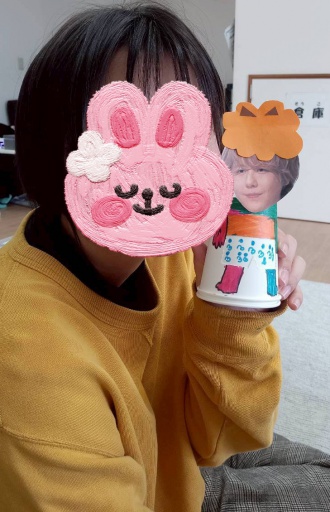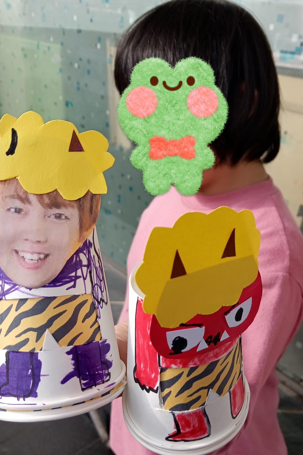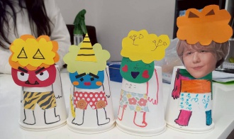 紙コップをふたつ合わせて、三種類のパンツをチェンジできるそれぞれの鬼さんができあがりました!