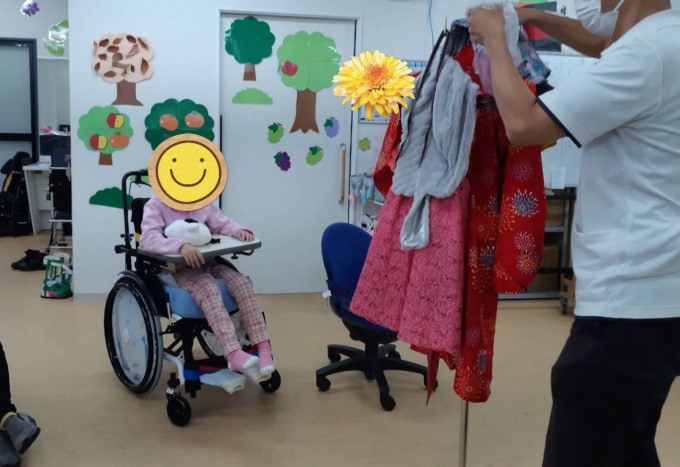 お友達の輪の中にハンガーにかかったお洋服が登場(*^-^*)