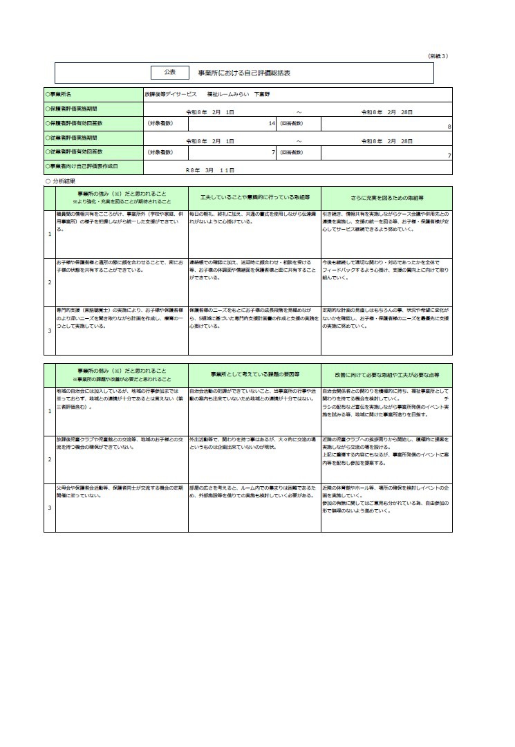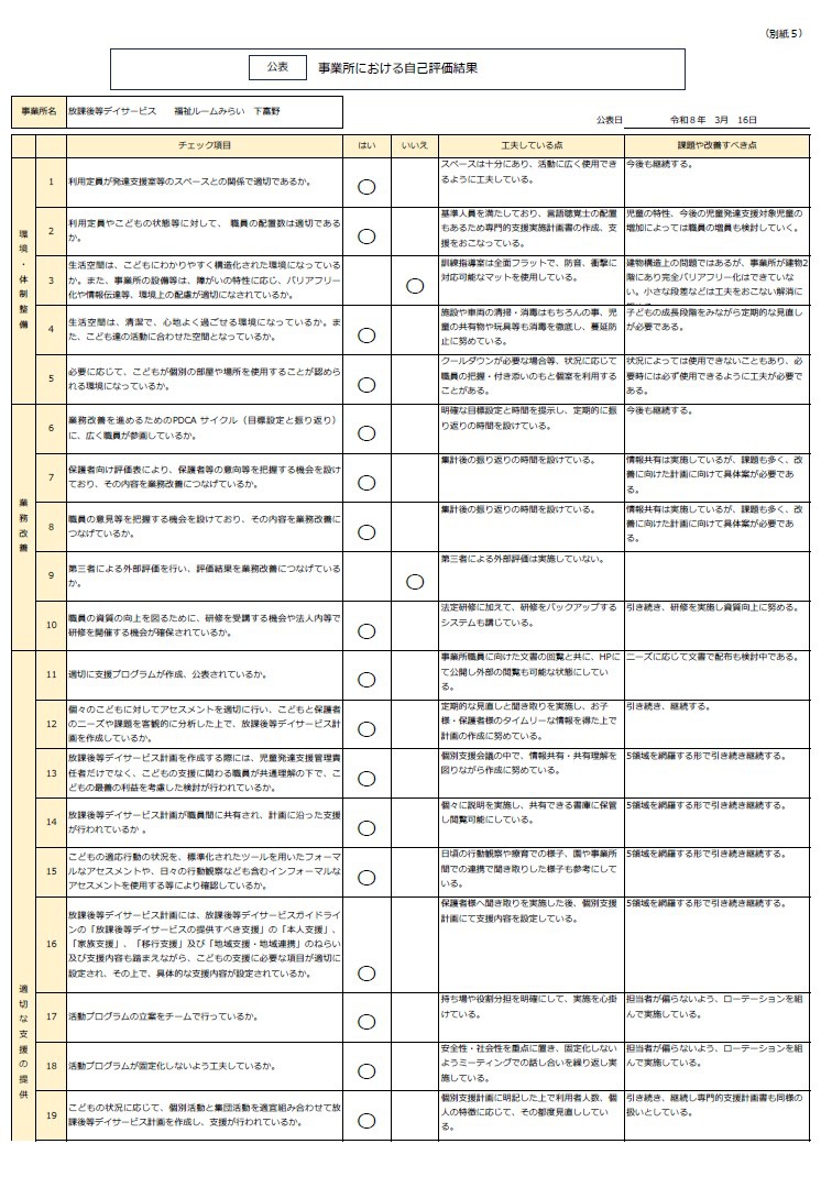 2026.03.16 令和7年度放課後等デイサービス自己評価を公表します