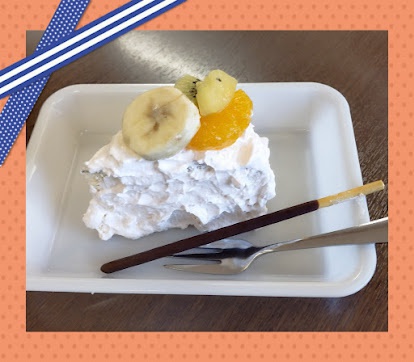 スポンジケーキの上に子どもたちが自分でイチゴ味の生クリームを塗り、好きな果物(キウイ・バナナ・みかん)