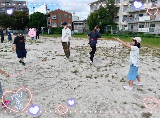 広場で縄跳びやケンケンパをして身体を動かして楽しむお友だち♪